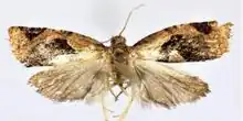 The head, antenna and labial palpus are yellowish brown, with scattered ochreous brown. The thorax and tegula are ochreous brown mixed with yellowish brown. The forewing is yellowish brown with sparse ochreous scales, but the costal fold is tinged with brownish black. The markings are brownish black mottled with ochreous. The hindwings are dark gray, distally with a pale grayish brown patch tinged with yellowish brown. The cilia are dark gray. The legs are dark yellow, tinged with brownish black on the ventral side of the foreleg and on the outer side of the mid- and hindlegs. The abdomen is grayish brown.