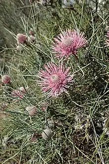 Isopogon divergens is a shrub that typically grows to a height of 0.3–2 m (1 ft 0 in – 6 ft 7 in) and has reddish brown branchlets. The leaves are 50–150 mm (2.0–5.9 in) long on a petiole up to 56 mm (2.2 in) long, pinnate or bipinnate with cylindrical leaflets 1–1.5 mm (0.039–0.059 in) wide. The flowers are arranged in spherical, oblong or oval, sessile heads 40–45 mm (1.6–1.8 in) long in diameter with egg-shaped involucral bracts at the base. The flowers are about 15–25 mm (0.59–0.98 in) long, pink, often tinted with mauve and are glabrous. Flowering occurs from August to October and the fruit is a hairy oval nut, fused with others in a spherical cone 15–25 mm (0.59–0.98 in) long.[2][3]