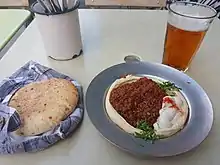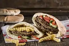Israeli pita, also known as pitot, Israeli pitta, or simply pita, is the Israeli version of pita flatbread that is commonly served with hummus and other dips, or as a sandwich bread stuffed with sabich, falafel, chicken schnitzel, shawarma, or other fillings. Israeli pita is commonly found in Israel, as well as in the United States, and at restaurants offering Jewish and Israeli cuisine worldwide.[3]