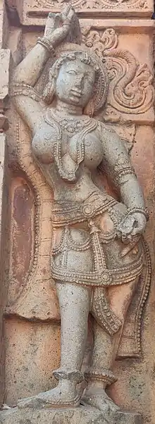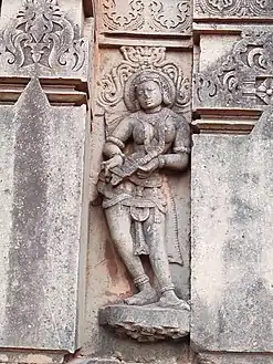 One of the main attraction of the temple sculptures is a sculpture of a lady, Shasana Sundari (Shilabalika), a mythological woman, depicted as inscribing Sanskrit epigraph in Kannada characters.[1] The figure in dancing position is seen inscribing the epigraph. The Shasanas praises Vikramaditya VI of the Chalukya dynasty. The writings is deciphered as "Saptadveepodaree Bhutam Bhutalam Sweekarishyati Chalukya Vikramaditya Saptamo Vishnuvardhanaha".[6] The translation is "Vikramaditya of Chalukya Dynasty captured and is ruling the land containing seven islands".[7] It can be noted from the posture of the figure that the body shows a twist beyond the navel as observed in belly twist (jathara parivartanasana). The neck is bent as in akashi mudra.[8]