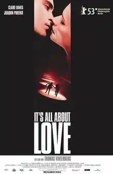 It's All About Love is a 2003 English-language Danish romance-drama film written and directed by Thomas Vinterberg. Its narrative can be classified as apocalyptic science fiction, but Vinterberg prefers to call it "a dream". Unlike the director's earlier Danish-language films, It's All About Love is entirely in English, and stars Joaquin Phoenix, Claire Danes and Sean Penn. The production was led by Denmark's Nimbus Film, but the film was largely an international co-production, with involvement of companies from nine different countries in total. It was very poorly received by film critics.