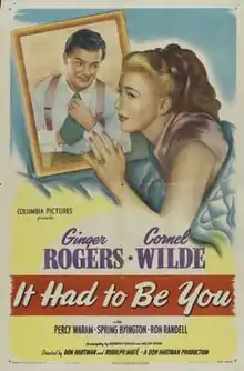 It Had to Be You is a 1947 American comedy romance film directed by Don Hartman and Rudolph Maté and starring Ginger Rogers and Cornel Wilde. It was produced and distributed by Columbia Pictures. A marriage-shy sculptor meets the boy of her childhood dreams, now a firefighter.