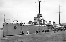 In the early 1930s, Quarto was sent to East Asian waters, where she replaced the cruiser Libia.[19] Quarto made a visit to Yokohama, Japan, in April 1934 as part of a mutual exchange of goodwill visits. The ship's captain and the Italian naval attache met with the Japanese naval minister, Admiral Mineo Ōsumi. In return, a pair of Japanese cruisers and a flotilla leader visited Italian ports later the same month.[20] The ship's stay there was short lived, as she was transferred to Africa to support the Second Italo-Ethiopian War in 1935–1936.[19]