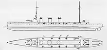 Quarto was armed with a main battery of six 120 mm (4.7 in) L/50 guns mounted singly;[lower-alpha 2] two were placed side by side on the forecastle, two on the main deck further aft, and two on the upper deck astern of the rear conning tower. These last two guns were slightly offset, with the port gun further aft.[2] The guns were the Pattern EE type, the same type employed as secondary guns on the dreadnought battleships of the Dante Alighieri and Conte di Cavour classes, and were manufactured by Armstrong Whitworth.[6] A secondary battery of six 76 mm (3 in) L/50 guns,[2] the same Pattern ZZI type guns used on the Italian dreadnoughts,[7] provided close range defense against torpedo boats. These were placed abreast the funnels, three on either side of the ship. She was also armed with two 450 mm (17.7 in) torpedo tubes in deck-mounted launchers, though shortly after her commissioning, these were replaced with submerged tubes. The torpedo tubes were placed in the ship's stern. Quarto was designed to carry 200 naval mines.[2][5]