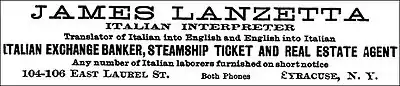 James Lanzetta - Italian Interpreter and Exchange Banker - 104 East Laurel Street, Syracuse, New York, Syracuse City Directory 1908