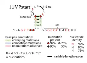 JUMPstart sequences include an ops element, which is an acronym for "operon-polarity suppressor" and has the nucleotide consensus GGCGGUAG.[4] The ops element acts in concert with the RfaH protein to improve transcription of genes downstream of the ops element, especially genes far away within long operons.[3][4][5][6]