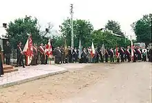 The detained Poles were herded onto Stanisław Szepietowski's property, the site of gendarme Klosser's earlier death.[3] They were confined within a farm building,[lower-alpha 2] which was later set ablaze and bombarded with grenades. Roughly 80 men, women, and children perished in flames. Ultimately, the Germans ransacked the abandoned farms and ignited the buildings.[3][6]