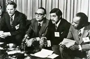(Left to right) Walt Humann, Lowe, Rene Martinez, and Zan Holmes at a press Conference announcing the formation of the Dallas Alliance in 1975.
