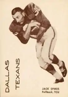Jack Erwin Spikes (born February 5, 1937) is a former American football running back and placekicker. He played in the American Football League (NFL) for the Dallas Texans/Kansas City Chiefs, Houston Oilers, and the Buffalo Bills. He played college football at Texas Christian University (TCU).
