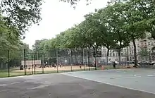 Jackie Robinson Park contains two playgrounds along the Bradhurst Avenue end, both with restrooms. The playgrounds are named after their respective cross streets, spelled out and in Roman numerals. Playground One Forty Nine CIL is at 149th Street, while Playground One Fifty Two CLII is between 152nd and 153rd Streets.[13] The playground at 152nd Street was previously the park's wading pool.[14][lower-alpha 2] There is also a recreational area along Bradhurst Avenue between the two playgrounds. This consists of two baseball fields at 150th Street,[15] one basketball court south of 150th Street, and four handball courts at 151st Street.[10] The sporting fields and playgrounds were built in 1936, as part of the Works Progress Administration (WPA) program, and have been modified since then.[16]