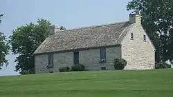 The house is a one-story, three-bay central hall plan house built of coursed limestone. Construction was by "the dry construction method of clay sealed with lime mortar." It is about 24 by 52 feet (7.3 m × 15.8 m) in plan, with a cellar; each of its two rooms, on either side of its hall, has an arched stone fireplace.[3]