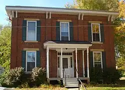 The Jacob Suiter House is a two-story, three bay structure built on a limestone foundation. It is constructed of bricks that were manufactured locally, and the structure features clean proportions and simple lines.[2] The residence is a variation on the vernacular Italianate style. The main entrance is located in the central bay and it is covered by a small wooden porch that is supported by slender turned posts. It features a bracketed cornice and corner pilasters. The house is capped with a low hipped roof. Built onto the back of the house is a single story addition with a gable roof that served as a kitchen. Beyond that is a smaller frame addition. It is essentially a smaller and simpler version of the Dawley House in Le Claire.[3]