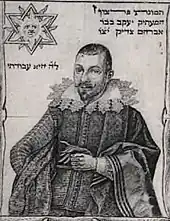 The colophon also contains a portrait of Zaddiq, and the text explains the portrait as well as the map. It states that it was engraved by Abraham Goos from Amsterdam. The map was to help Jews become acquainted with the Holy Land that God had given them, and he added the portrait "so that my people will preserve a good keepsake of me". He had himself depicted as a baroque gentleman, a reputable, dignified, and important Spanish courtier—a representation far removed from reality.[7][8]