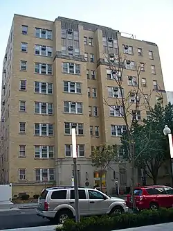 The building was designed by Robert O. Scholz and was built in 1938.[2] The building is similar in style as the neighboring Munson Hall. It is eight stories tall, and features two bays. The exterior is faced with buff brick. The main entrance is in the recessed space between the two bays. Cast stone scrollwork is found over the door and surrounding the first floor and eighth floor windows. There are three medallions on each bay along a horizontal cast stone band above the sixth floor. In 1995 the building was named for Jacqueline Bouvier Kennedy Onassis, who graduated from GW in 1951. It was listed on the District of Columbia Inventory of Historic Sites and the National Register of Historic Places in 2010.