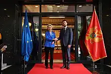 In June 2023, Milatović stated that he expects Montenegro to join the European Union by 2027 or 2028.[27] In August 2023, he met with Ukrainian president Volodymyr Zelenskyy in Athens, stating that Montenegro "openly and strongly condemns Russia's unprovoked aggression against Ukraine."[28]