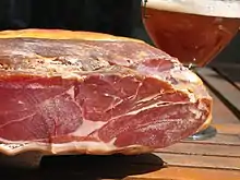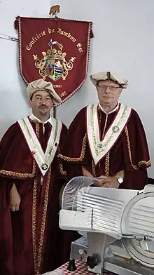 In 1985, the Confrérie du Jambon sec d'Ardennes was founded, bringing together charcuterie and catering professionals, tasters and gastronomes, to raise awareness of the product.[7] In 1988, Jambon sec des Ardennes and Noix de Jambon sec des Ardennes were awarded an official sign of superior quality and origin, a regional agricultural label (homologation no. 18-88 of the regional label Ardennes de France). Protected Geographical Indication (PGI) commercial protection was obtained in October 2001. However, the abolition of regional labels in France in 2003 led to the label being put on hold. The labeling process was relaunched in 2010,[8] to be completed in 2015.[9][10]