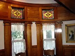 View of the dining room alcove detailing the stained glass windows, pillars, and decorative dentil molding.