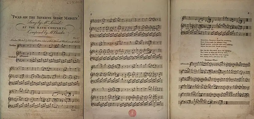 - ↑ Brooks, James (1795). Twas on the Severns sedgy margin. / Sung by Mrs. Second at the Bath concerts, ; composed by Mr. Brooks. London: Preston & Son. British Library: Music Collections G.296.ee.(3.), Music Collections DRT Digital Store G.296.ee.(3.).