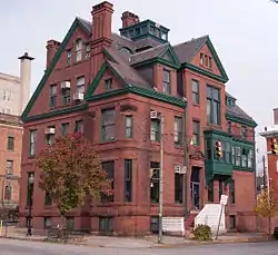 James E. Hooper House is a historic home located at Baltimore, Maryland, United States. It is a large Queen Anne style freestanding masonry structure, situated among the buildings of the Old Goucher College Buildings complex. It is a rectangular building with a steeply pitched gable roof, a small, two-story wing extending, and a 2+1⁄2-story bay window extension, with a small gable roof. There are two stories in the main section of the house, and two more stories in the gable. It is constructed of dark red bricks with terra cotta, brownstone, and granite trim. The exterior features a slate shingle roof, and a square oriel, three bays wide and one bay deep, made of wood, and painted green. The house was constructed in 1886 for James E. Hooper (1839–1908).[2]