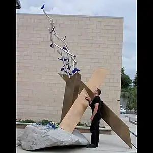 Touching the Intangible (2013) is part of the Fred Hutchinson Cancer Research Center's art collection. The sculpture represents the efforts of doctors and scientists who search for the causes and cures of HIV/AIDS and other infectious diseases. From the artist: "Everyone at The Hutch is on a never-ending search for cures for diseases. The irony is that once they discover a potential cure, they simply pass it on to others to carry on the work and begin their search all over again with yet another disease. They are on the cutting edge of discovery."[1] The sculpture stands in front of the FHCRC's Vaccine and Infectious Disease Building in Seattle.