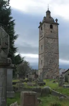 During his period of occupancy, in 1746 St Ninian's Church was blown up as part of the Jacobite Uprising of 1745. The Jacobite forces at gathered on the morning of 1 February 1746 at the church, but Bonnie Prince Charlie was late to arrive. They were trying to organise a systematic retreat of the Jacobite forces due to approaching forces from Edinburgh. Lord George Murray was therefore in charge. At some point, the church which was being used as a gunpowder store, blew up. It is unclear if this was a complete accident or a deliberate act gone wrong (as many people were injured).[2] The congregation met in the West Church of Stirling until a new church was built in 1750.[3]