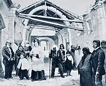 On San Carlos Day, November 4, 1879, Scottish novelist Robert Louis Stevenson visited the Carmel Mission to hear the a mass at the church that had fallen into disrepair. A drawing by Joseph D. Strong shows Jules Simeenau, Meadows and his wife, and Father Angel Delfino Casanova standing in front of the church.[13]