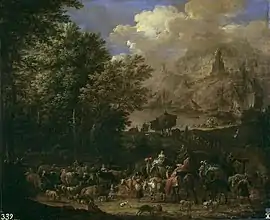 Jan Baptist van der Meiren painted small landscapes with scenes of Italianised markets and ports in the same vein as Pieter Bout. He also painted cavalry encounters and biblical scenes in exotic landscapes.[2] He occasionally painted the figures in the landscapes of Adriaen Frans Boudewijns.[4]