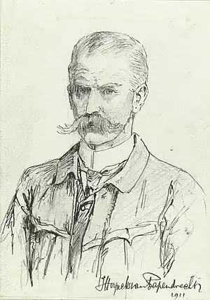 Alongside his interest in military art, Hoynck van Papendrecht was deeply involved in landscape painting as well as portraiture. Owing to his careful study of his subjects and an acute eye for detail, his works are often treated as historical sources of information. He was recruited by the British art weekly The Graphic to make sketches of delegates to the Hague Conventions, in addition to the portraits of soldiers that he already published in it.[5]