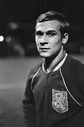 After playing only 17 games at the highest level, Van Beveren debuted for the Netherlands national football team at age 19.[10] His first match was a 3–1 victory over the Soviet Union.[8] In the following years, Van Beveren became the first goalkeeper for the national team. But to his discontent, he faced the problem of playing with unmotivated Ajax and Feyenoord players who could achieve considerable more success and bigger financial gain at their clubs.[18][5] After failing to qualify for the 1970 FIFA World Cup, Van Beveren lashed out against his teammates: "we lost because some players didn't want to put themselves out. They were only talking about money. (…) If you play for your nation, who cares about money?"[2][9] In the Euro 1972 qualification, Van Beveren appeared in six matches, but the Netherlands again failed to qualify.[2][19] For the 1974 World Cup, he played four qualification matches, but a groin injury sidelined him for the final matches.
