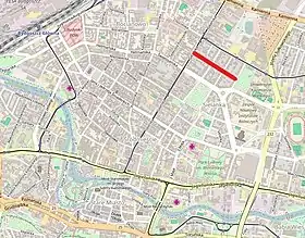 The street is located to the north of downtown district (Polish: Śródmieście), and follows a west–east axis, parallel to the north to Adam Mickiewicz Alley. To the west, it starts at Gdańska Street and its western tip ends when meeting with Niemcewicza street: in its course, it crosses 20 Stycznia 1920 and Paderewskiego streets.