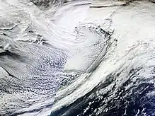 Early on January 3, the winter storm produced blizzard conditions, high wind gusts, and cold temperatures across portions of the Northeastern United States.[3] Several hours later, the low-pressure area moved away from the United States, though snow showers lingered throughout the Northeast.[3] After it had left the coast early that morning, it continued to strengthen and turn to the northeast, and late on January 4, it reached its peak intensity of 936 millibars (27.6 inHg) while situated near Greenland. It was then absorbed into another extratropical cyclone, which later developed into Cyclone Christina which brought high winds to western Europe several days later.