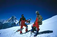 ![]() Polish mountaineers Janusz Majer and Walenty Fiut on top of Broad Peak, with K2 in the background | |