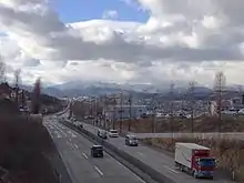 The Ayashi Bypass section of the highway in Sendai looking west towards the Ōu Mountains