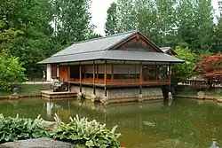 The skilled Japanese gardeners landscaped the chosen site with a small hill, flowing brook, waterfall, pebbly beach, bridges, tea house and a number of other traditional Japanese buildings.[2][1] Stones were brought from Austria to build the bridges, whereas the buildings were built exclusively with materials brought in from Japan.[1] Many trees and bushes were planted.[1] Measuring 2.5 hectares, Hasselt's Japanese garden is the largest Japanese garden in Europe.[4][5][6]