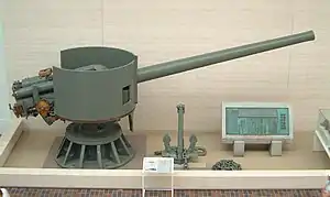 Mutsu's eight 45-caliber 41-centimetre (16.1 in) guns were mounted in two pairs of twin-gun, superfiring turrets fore and aft. Numbered one to four from front to rear, the hydraulically powered turrets gave the guns an elevation range of −2 to +35 degrees. The rate of fire for the guns was around two rounds per minute.[9] A special Type 3 Sankaidan incendiary shrapnel shell was developed in the 1930s for anti-aircraft use.[10] The turrets aboard the Nagato-class ships were replaced in the mid-1930s using those stored from the unfinished Tosa-class battleships. While in storage the turrets were modified to increase their range of elevation to −3 degrees to +43 degrees,[9] which increased the guns' maximum range from 30,200 to 37,900 metres (33,000 to 41,400 yd).[11]