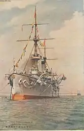 The contract for Tokiwa was signed on 6 July 1897 with Armstrong Whitworth. The ship had already been laid down at their shipyard in Elswick on 6 January 1897 as a speculative venture. She was launched on 6 July 1898 and completed on 18 May 1899. The ship departed for Japan the next day and arrived in Yokosuka on 16 July.[10] Captain Dewa Shigetō had been appointed on 5 April to supervise her construction and bring her to Japan. He was relieved of command after his arrival by Captain Nakayama Nagaaki.[11] The following year, Tokiwa supported Japanese forces during the Boxer Rebellion in China.[12]