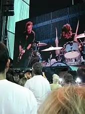 Once the initial portion of the tour began in early April 2009, Weinberg played from several songs to half the show on most of the dates.[10][14][17][18] He received a very positive reaction from both audiences and reviewers as a re-energizing "spark plug"[18] for the much-older band,[19] with his vigorous, long-hair-flying style inviting comparisons to Dave Grohl[20] and his potential for replacing his father drawing allusions to Wally Pipp.[9][17] He began playing complete shows in mid-May 2009 during the tour's American first leg, as his father went to California to prepare test runs for The Tonight Show start.[11][19] Modern Drummer magazine's editor said that a college freshman playing on one of the year's biggest rock tours is "certainly a unique story".[11] Weinberg played a number of dates early on in the European second leg of the tour, including at the Dutch Pinkpop festival in Landgraaf, Netherlands in addition to Bonnaroo in Manchester, Tennessee. He also played during a few dates of the American third and final leg. When not needed for the Springsteen tour, he continued to play for the Reveling, often before audiences that were three orders of magnitude smaller; he said of the difference, "I liked the duality of it all ... I like doing this just as much as I like doing that."[14]
