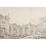 Ango's personal drawing style has only recently been recognized. For a long period after the eighteenth century, his drawings were attributed to Hubert Robert, whose drawings Ango copied and whose counterproofs he drew over.[1] Ango habitually signed his drawings H. Roberti (H for Hannibal, his nickname) and Roberti for Robert, his last name.[3] His drawings were (and still are) confused with those of Robert, many of them being signed "Roberti." Over the past few decades, drawings in the collections of various museums, such as Harvard's,[4] have been reattributed. However, many of Robert's drawings, in particular those at the Louvre, remain contested.[5][2]