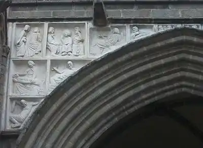 Boucher was also commissioned to create a sculpture allegorically representing the union of Brittany with France. This too created controversy, particularly among Breton nationalists, who resented the union and the erosion of Brittany's distinct culture. They complained that the portrayal of Anne of Brittany was demeaning, as she was shown kneeling to the French king. The Breton Nationalist Party was founded to protest its creation, and in 1932 the sculpture was bombed by Gwenn ha du, a Breton separatist terrorist group led by Célestin Lainé. The date was designed to coincide with anniversary of Breton union with France in 1532.[2] Fragments of the broken work have been preserved.