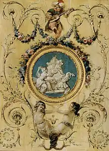 The date of the room is assigned to 1781-82, and Rousseau's authorship of much of its decoration is rendered certain by a sketch of his which still survives. The decoration was inspired to themes taken from the excavations of Pompeii. The tall narrow panels are painted in medallions with amorini; festoons and bouquets of flowers fill every available space; the shutters are painted with doves and shepherdesses. Lagrene's pictures in the upper lunettes represent the elements; upon the ceiling is Jupiter enthroned within a deep blue border. It is a melancholy reflection that M. de Sévilly, whom his wife and Marie Antoinette combined to surprise with this chefdoeuvre, was guillotined, and that his wife, whose sitting-room it was, was condemned to die with him and with Madame Élisabeth de France, whom they had befriended, but was saved, against her will, by the princess, who made a false declaration as to her condition. She had two subsequent husbands, and lost them both in little more than two years. She herself lived less than five years after her delivery by the fall of Robespierre.