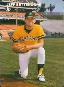 Bettendorf was primarily a starting pitcher over the course of his nine-season professional baseball career. He was a second-round draft selection in the 1979 Major League Baseball Draft by the New York Mets. After never advancing above Double-A in the Mets system, Bettendorf was drafted by the Oakland Athletics in the December 1983 Rule 5 draft. After making the A's major league roster, as is required under Rule 5, he made his first major league appearance on April 8, 1984, against the Boston Red Sox at the Oakland Coliseum, earning a save in three no-hit scoreless innings.[1] He would go on to pitch in a total of three games for the A's, giving up 5 runs in 9 innings.[2] On May 9, 1984, Bettendorf was traded back to the Mets for a conditional pick and immediately optioned to the Double-A Jackson Mets. He would not return to the majors.
