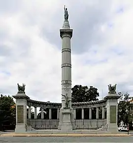 The east-facing monument sported a 67-foot-tall (20 m) Doric column topped by a female bronze figure called Vindicatrix, an allegorical representation of Southern womanhood.[3][lower-alpha 1] There were thirteen columns, eleven bronze seals representing the seceding states and two representing states that sent troops for the Confederacy. Two square piers at either end of the colonnade are topped with eagles and faced with plaques. The bronze statues, Vindacatrix and Jefferson Davis in the center the latter situated atop a block of granite[6][7] were designed by Edward Virginius Valentine; the arrangement was planned by William C. Noland.[1]:12