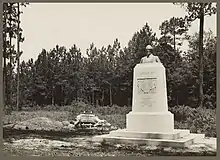 The United Daughters of the Confederacy erected a monument on the exact spot where Davis was captured.[16] It consists of a granite stele set upon a stepped granite base, the stele features relief panels and inscriptions, and atop it is a bronze bust of Davis modeled by Atlanta sculptor Laurence Tompkins.[17] The relief on the front depicts a captured Davis flanked by two Union soldiers; the relief on the back depicts a battle scene; the reliefs on the sides depict the Confederate flag. The monument was dedicated on June 3, 1936.[17]
