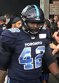 ![]() Thomas before a Toronto Argonauts game in 2019. | |