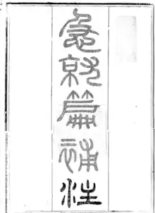 The title Jíjiùpiān uses the word piān 篇, which is attested in Han dynasty texts with the meaning of "book, written document" (such as in the Hanshu 漢書 chapter on Wu Di, "著之於篇,朕親覽焉。"[1]). Several other Chinese dictionary titles use pian, for example, the (c. 500? BCE) Shizhoupian "Historian Zhou's Chapters" (c. 220 BCE) Cangjiepian "Cangjie's Chapters" (c. 543) Yupian "Jade Chapters", and (1066) Leipian "Categorized Chapters".