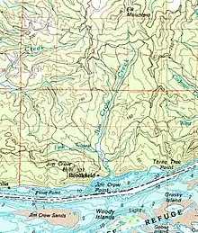 The origin of the name Jim Crow Creek was a reference to James D. Saules, a free black sailor who travelled widely throughout the Pacific in the 1800s. He was part of the United States Exploring Expedition. After the Cockstock incident along the lower Columbia River four nearby places where named "Jim Crow" due to Saules's involvement: Jim Crow Creek (Harlows Creek), Jim Crow Hill (now Beare Hill), Jim Crow Point (now Brookfield Point), and Jim Crow Sands.[2] The incident also contributed to the Provisional Government of Oregon enacting the Oregon black exclusion laws. All three "Jim Crow" places names in Washington were renamed in 2017 due to the efforts of Washington Senator Pramila Jayapal. Jim Crow Sands, in the Columbia River, is in Oregon and has not been renamed as of 2023.[3]