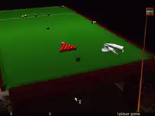 A number of features from Whirlwind Snooker were improved upon for Cueball, most notably the graphical engine.[3] The game uses a 3D accelerator card enabling the player to peruse the table and the entire snooker or pool room.[4] The shadows and reflections of the balls are rendered in much more detail, as are the cushions and pockets. The computer player (represented by a pair of disembodied hands in white gloves) can be viewed from any angle while taking a shot; these hands also visibly replace the coloured and cue ball once potted.[5]