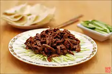 Jingjiang rousi (simplified Chinese: 京酱肉丝; traditional Chinese: 京醬肉絲; pinyin: Jīngjiàng ròusī), or sauteed shredded pork[1] in sweet bean sauce,[2] is a traditional dish in Beijing. Its main ingredient is pork tenderloin, which is stir-fried with soya paste or sweet soya paste for flavour. The dish is served with shredded leek (only using its white stalk) and doupi (dried tofu layer) to wrap. A vegetarian variant uses fried tofu puffs in place of pork.