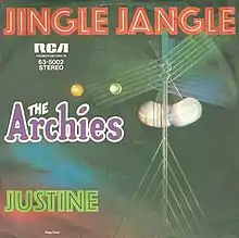 "Jingle Jangle" is a song written by Jeff Barry and Andy Kim and performed by The Archies.[2] It was produced by Jeff Barry.[3] The single reached number 10 on the Billboard Hot 100 and number 27 on the U.S. Easy Listening chart in 1969.[4] In January 1970, it went to number 1 for one week in Canada. The song appeared on the 1969 album, Jingle Jangle.[5]
