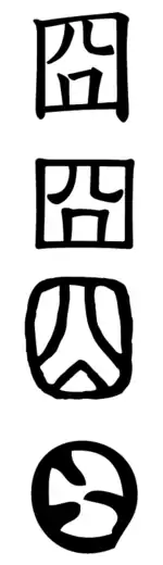 Jiong (囧) in Kaishu, Clerical, Seal and Oracle bone scripts (top to bottom)